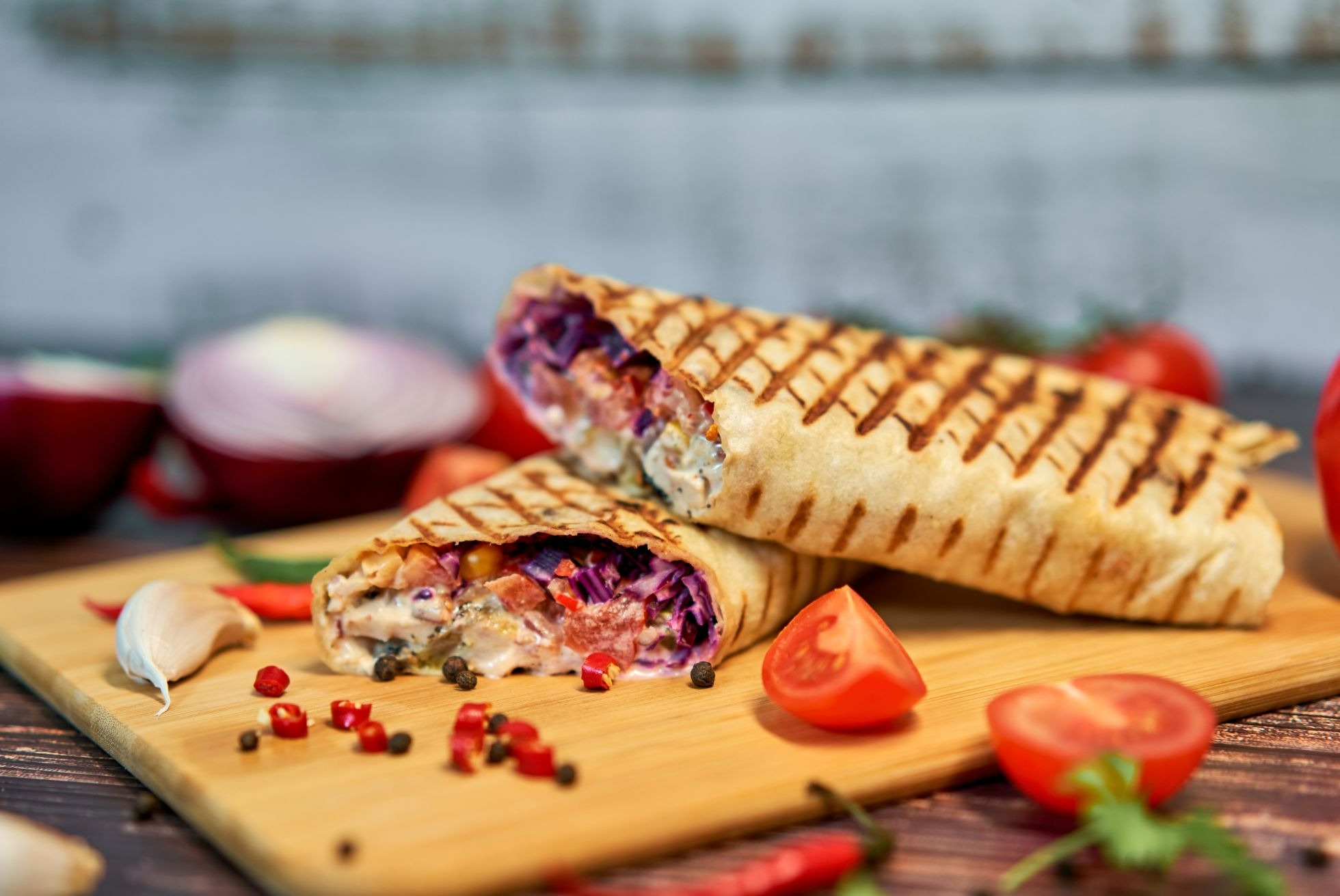 mięso do wyboru, kapusta biała, kapusta czerwona, sałata lodowa, cebula, ogórek, pomidor, sos do wyboru -